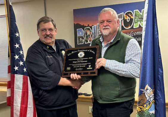 3/24/2025 Congratulations to the Bridgton Fire Department for earning the Safety & Health Award for Public Employers. Steve Greeley presents Fire Chief Glen Garland with the SHAPE award.