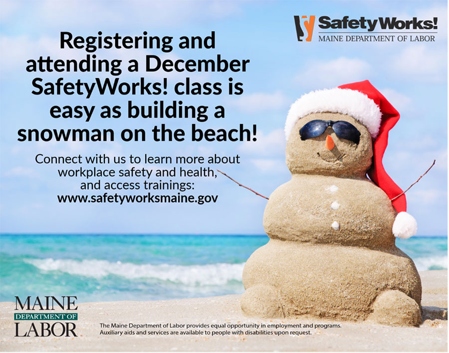 Registering and attending a SafetyWorks! class is easy as building a snowman on the beach! Workplace safety, health, and labor law requirements can seem complex - join the Maine Department of Labor, SafetyWorks! for no-cost upcoming December trainings! All classes are in Augusta unless otherwise specified.